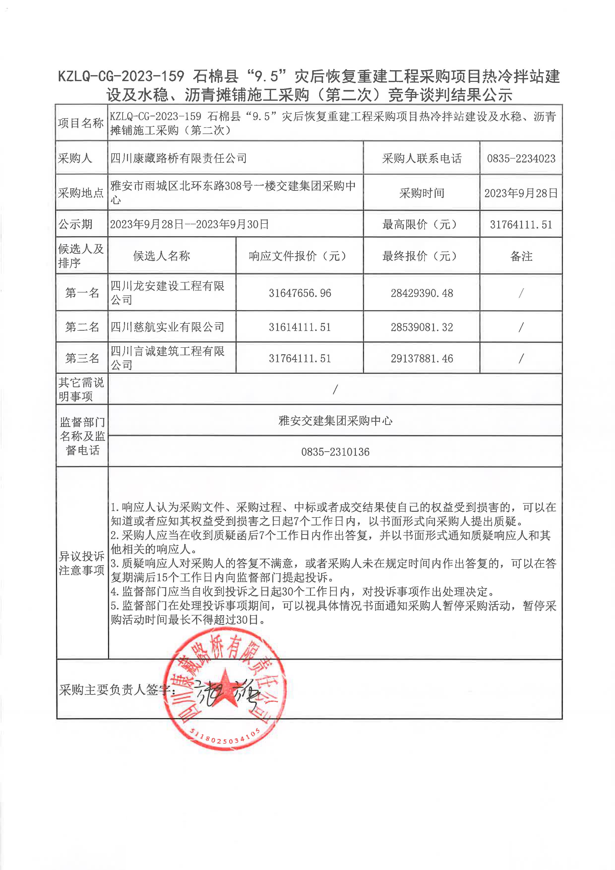 四川康藏路橋有限責(zé)任公司石棉縣“9.5”災(zāi)后恢復(fù)重建工程采購項(xiàng)目熱冷拌站建設(shè)及水穩(wěn)、瀝青攤鋪施工采購(第二次)競(jìng)爭(zhēng)談判結(jié)果公示