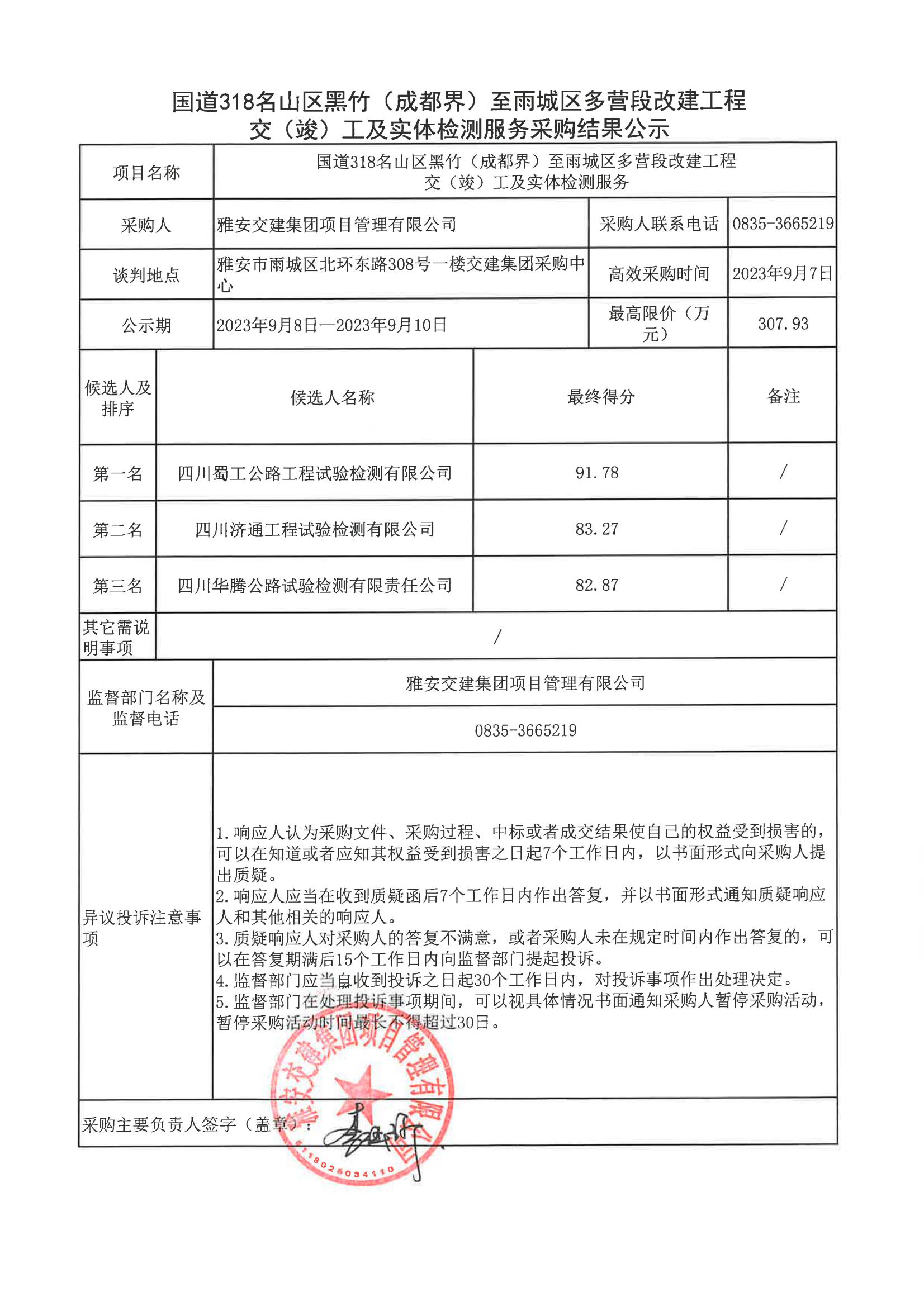 雅安交建集團項目管理有限公司國道318名山區(qū)黑竹(成都界)至雨城區(qū)多營段改建工程交(竣)工及實體檢測服務采購結(jié)果公示