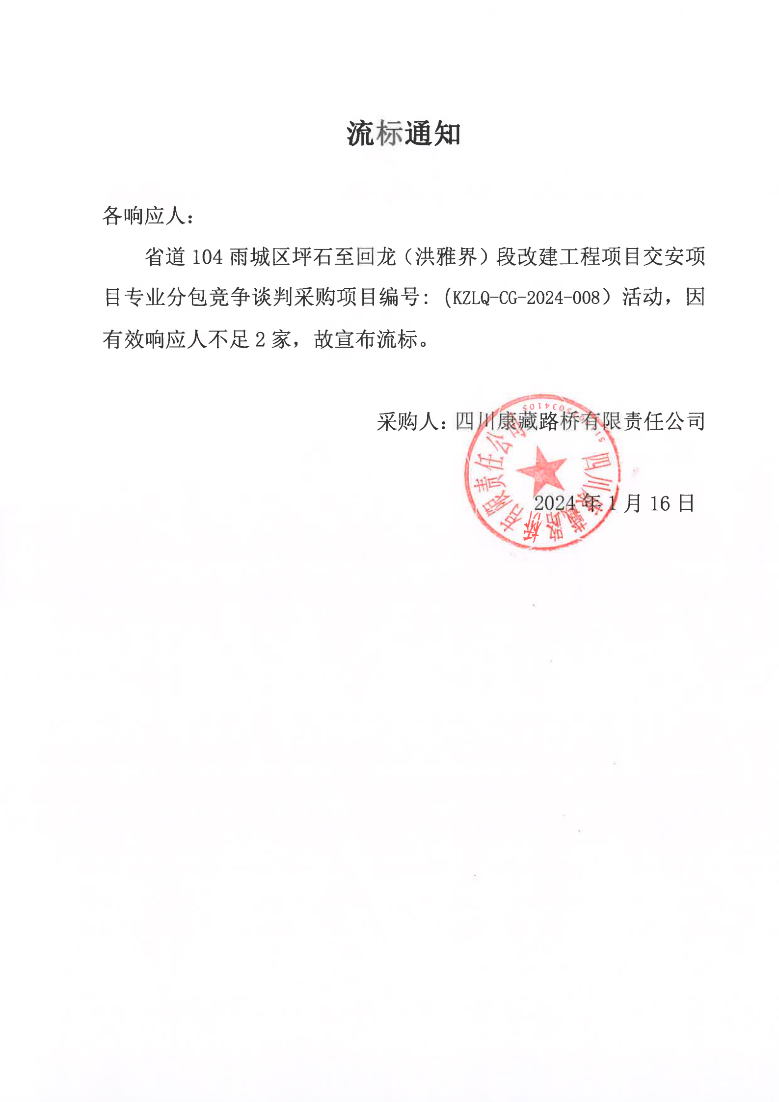 四川康藏路橋有限責(zé)任公司省道104雨城區(qū)坪石至回龍(洪雅界)段改建工程項目交安項目專業(yè)分包競爭談判采購流標通知