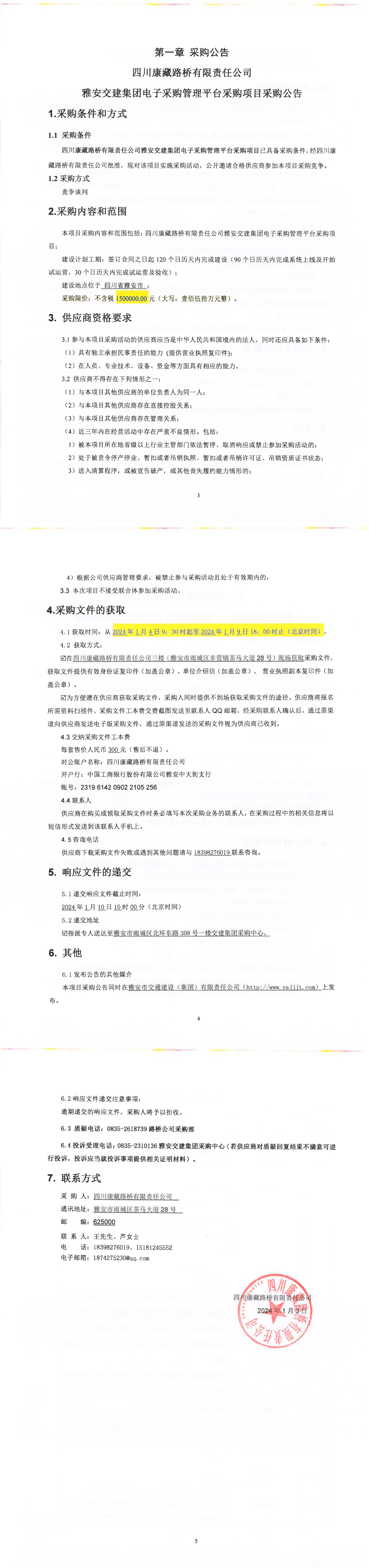 四川康藏路橋有限責任公司雅安交建集團電子采購管理平臺采購項目采購公告