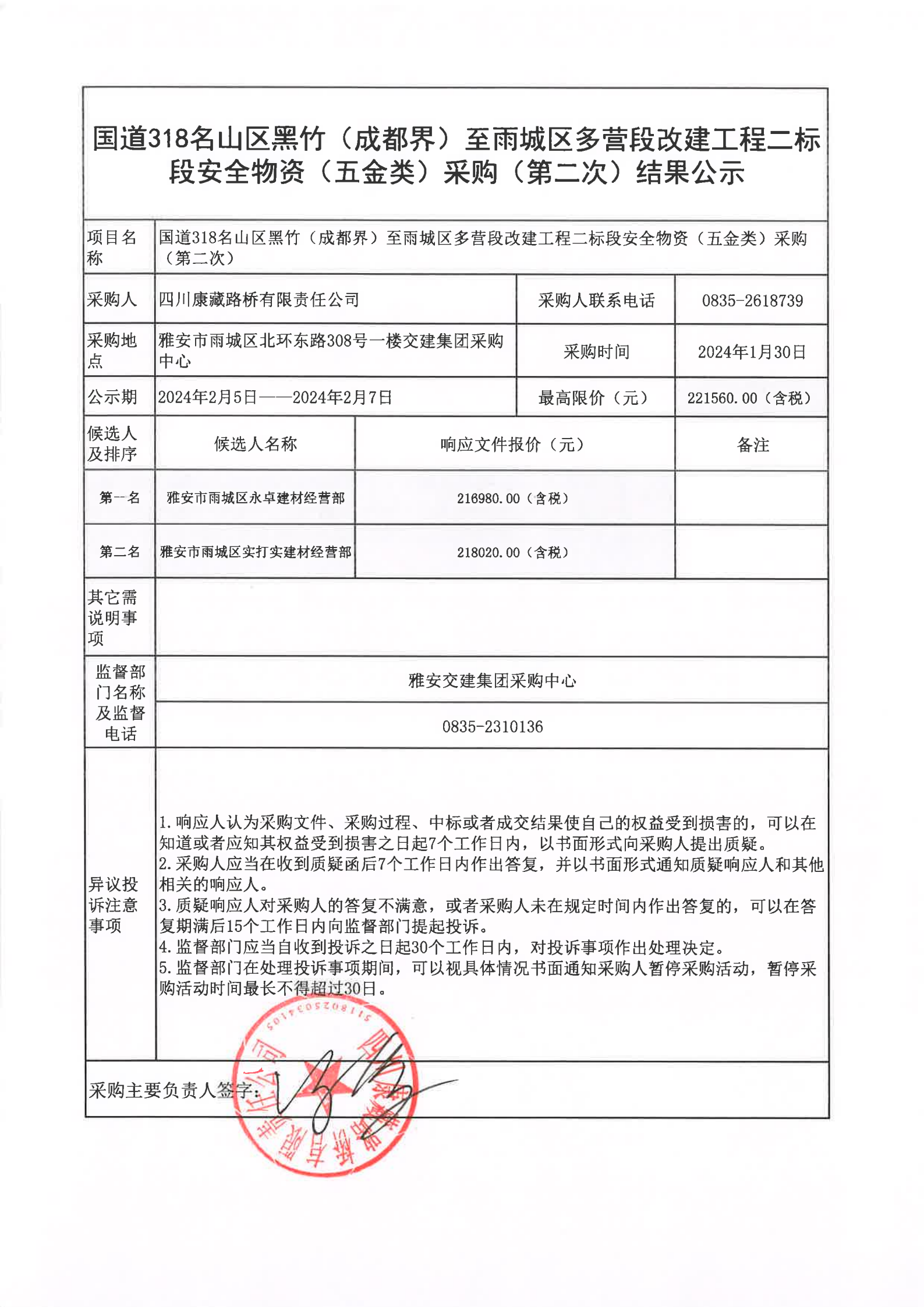 四川康藏路橋有限責任公司國道318名山區(qū)黑竹(成都界)至雨城區(qū)多營段改建工程二標段安全物資(五金類)采購(第二次)結(jié)果公示