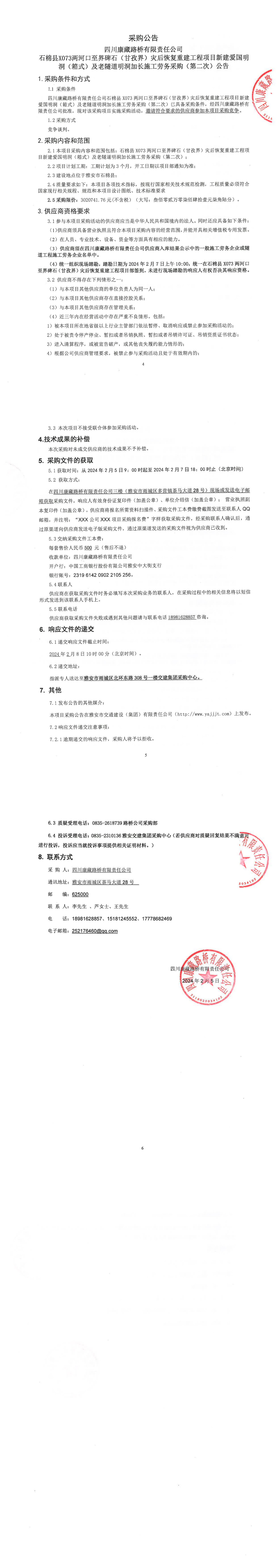 四川康藏路橋有限責任公司石棉縣X073兩河口至界碑石(甘孜界)災后恢復重建工程項目新建愛國明洞(箱式)及老隧道明洞加長施工勞務采購(第二次)公告