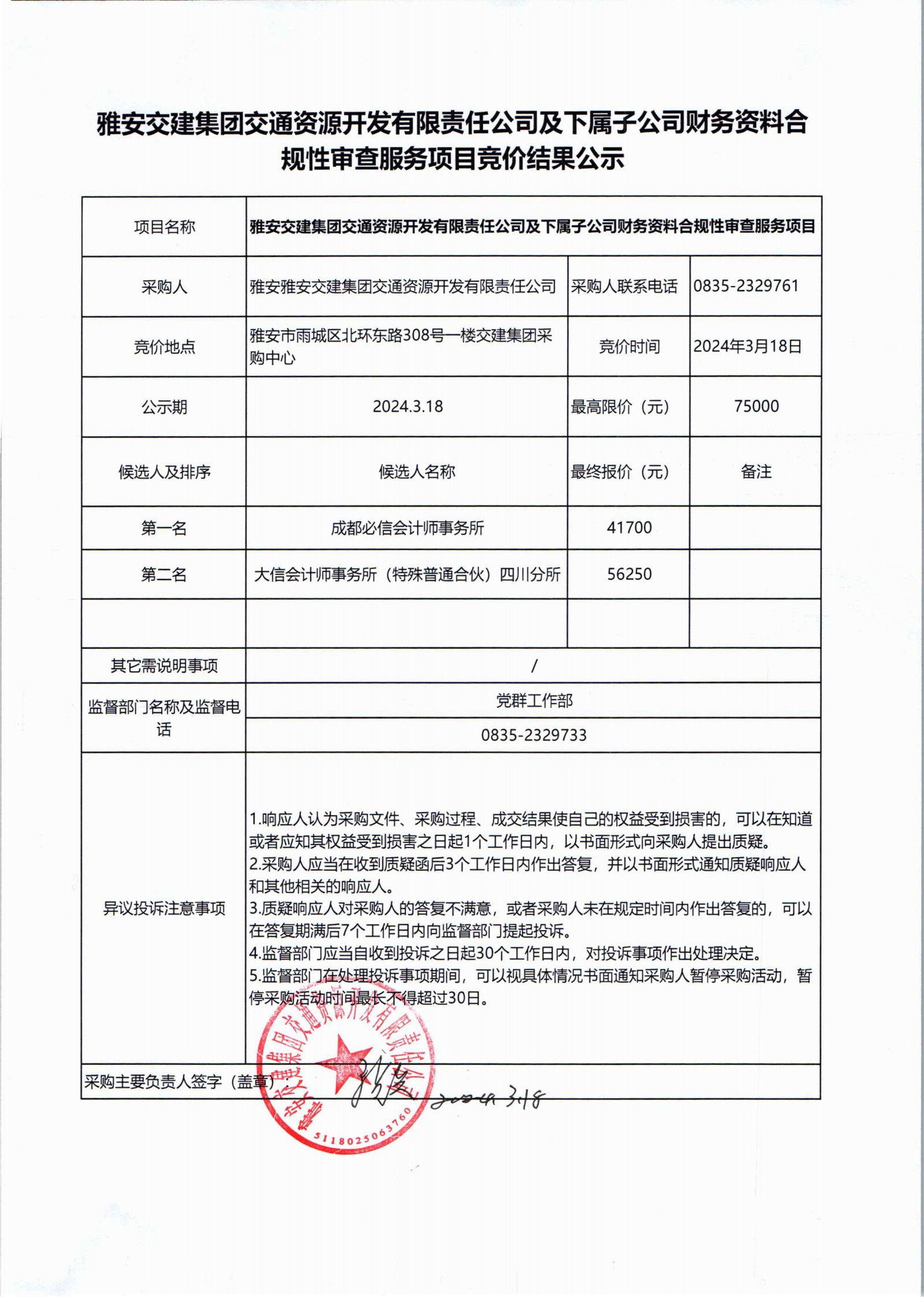 雅安交建集團交通資源開發(fā)有限責(zé)任公司及下屬子公司財務(wù)資料合規(guī)性審查服務(wù)項目競價結(jié)果公示