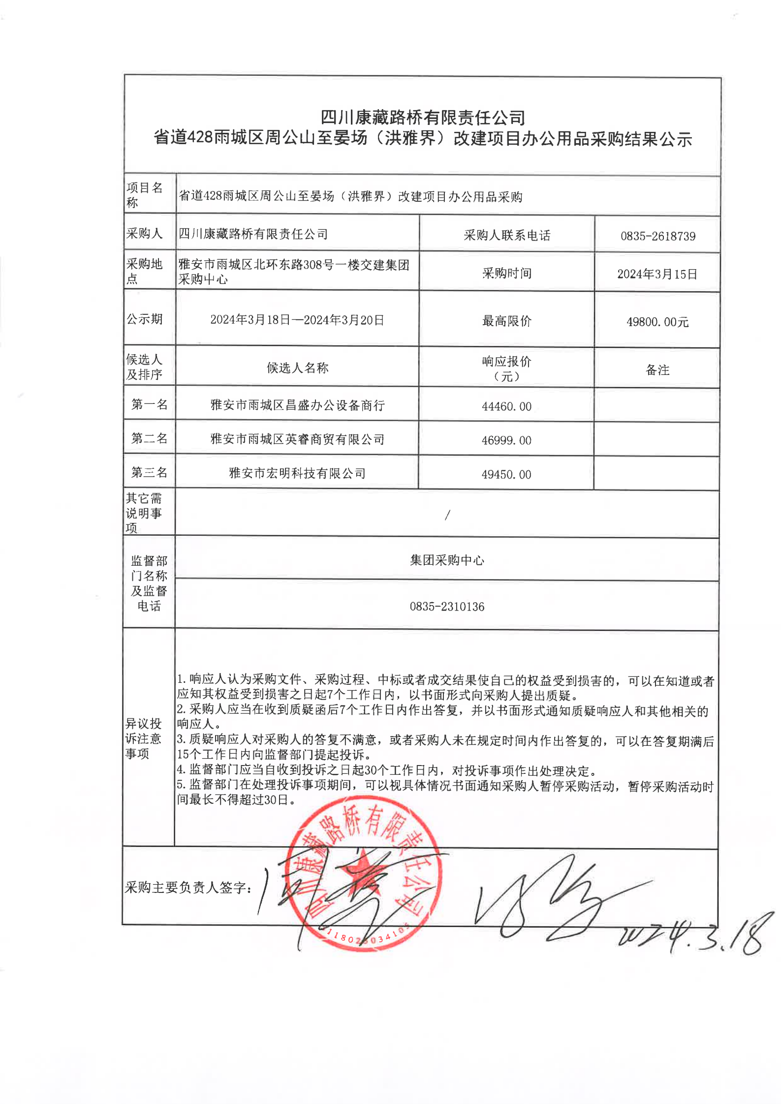 四川康藏路橋有限責(zé)任公司省道428雨城區(qū)周公山至晏場(chǎng)(洪雅界)改建項(xiàng)目辦公用品(第二次)采購(gòu)結(jié)果公示