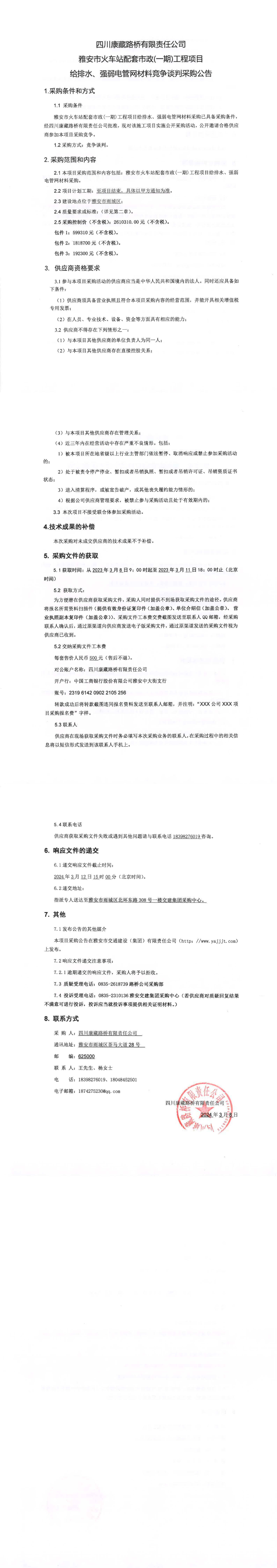 四川康藏路橋有限責(zé)任公司雅安市火車站配套市政(一期)工程項(xiàng)目給排水、強(qiáng)弱電管網(wǎng)材料競(jìng)爭(zhēng)談判采購公告