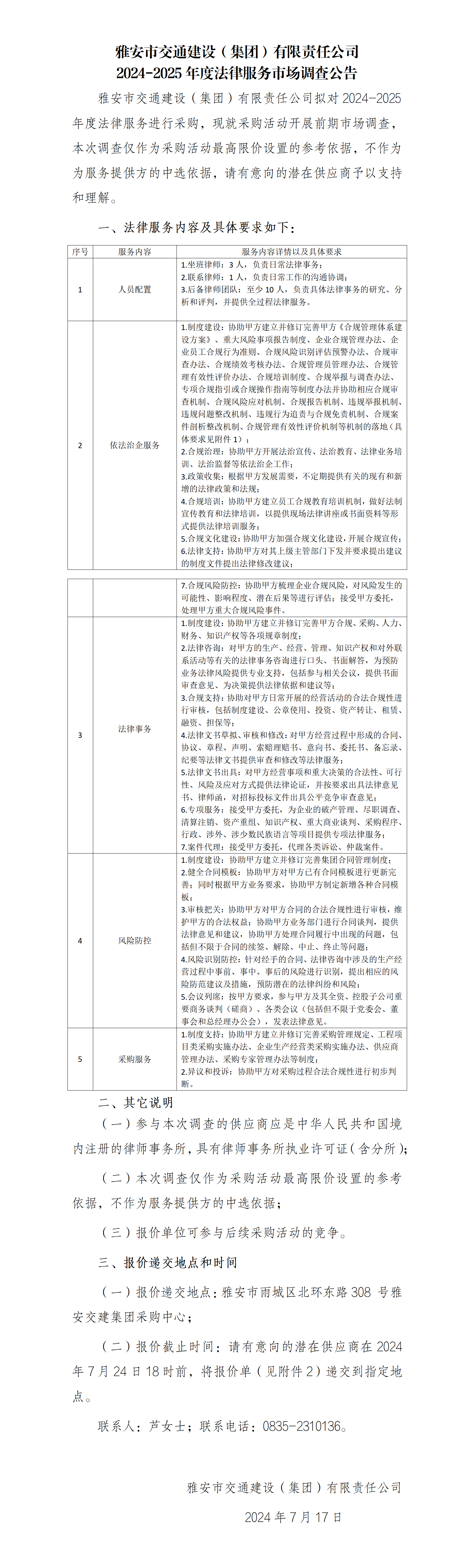 雅安市交通建設(集團)有限責任公司2024-2025年度法律服務市場調(diào)查公告