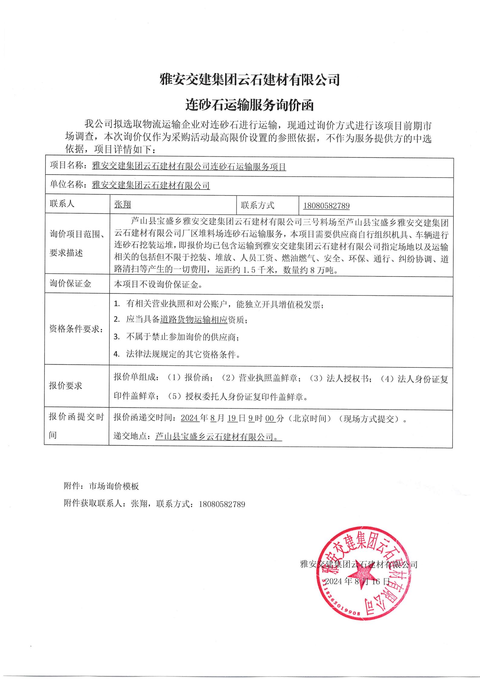 雅安交建集團(tuán)云石建材有限公司連砂石運(yùn)輸服務(wù)詢價(jià)函