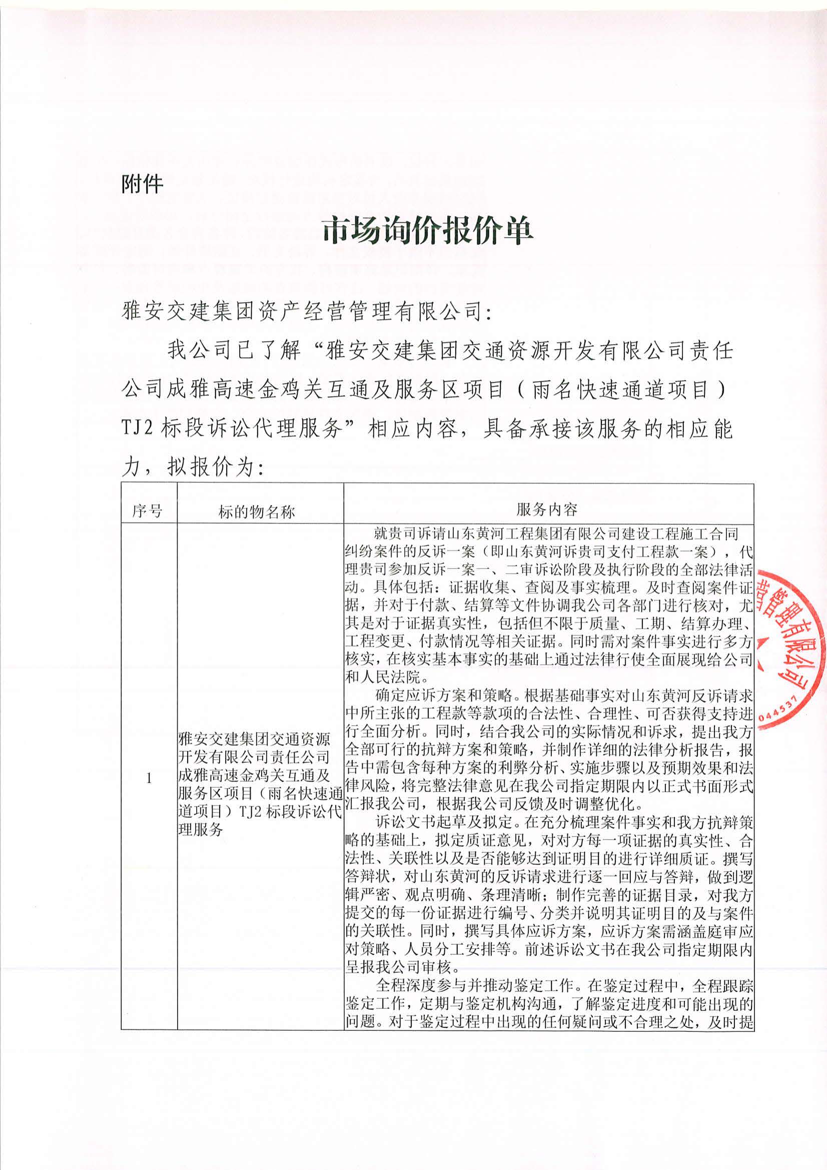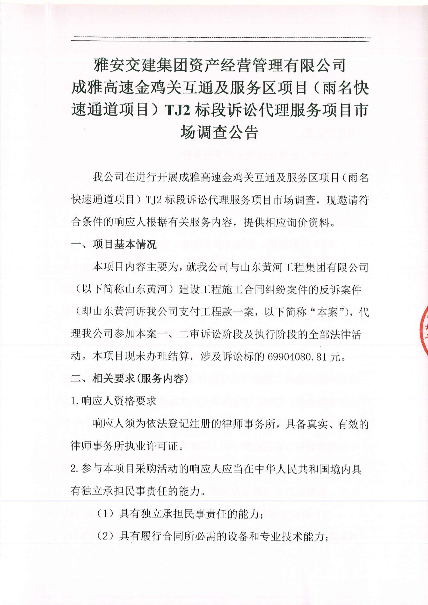 雅安交建集團資產(chǎn)經(jīng)營管理有限公司成雅高速金雞關(guān)互通及服務(wù)區(qū)項目(雨名快速通道項目)TJ2標(biāo)段訴訟代理服務(wù)項目市場調(diào)查公告