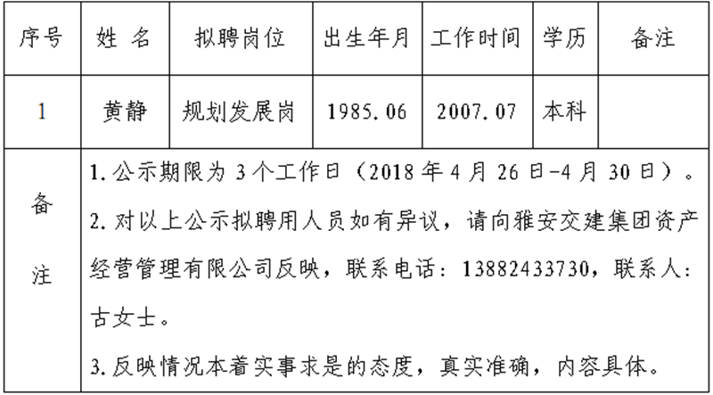 通過(guò)公開報(bào)名、資格審查、面試等程序,經(jīng)雅安交建集團(tuán)資產(chǎn)經(jīng)營(yíng)管理有限公司研究擇優(yōu)確定以下1名擬聘用人員,現(xiàn)公示名單如下: