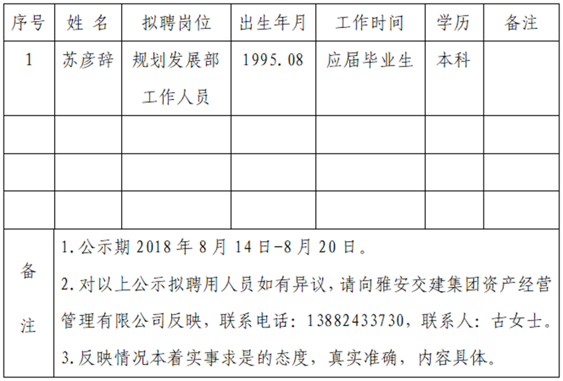 通過公開報(bào)名、資格審查、筆試、面試等程序,經(jīng)雅安交建集團(tuán)資產(chǎn)經(jīng)營管理有限公司研究擇優(yōu)確定以下1名擬聘用人員,現(xiàn)公示名單如下: