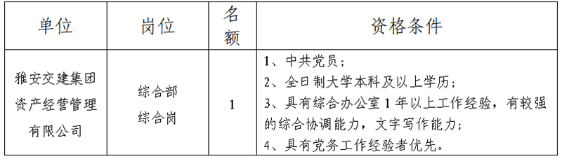 根據(jù)發(fā)展需要,決定面向社會(huì)公開(kāi)招聘雅安市交通建設(shè)(集團(tuán))有限責(zé)任公司(以下簡(jiǎn)稱“雅安交建集團(tuán)”)所屬子一般工作人員1名,現(xiàn)將有關(guān)事項(xiàng)公告如下: