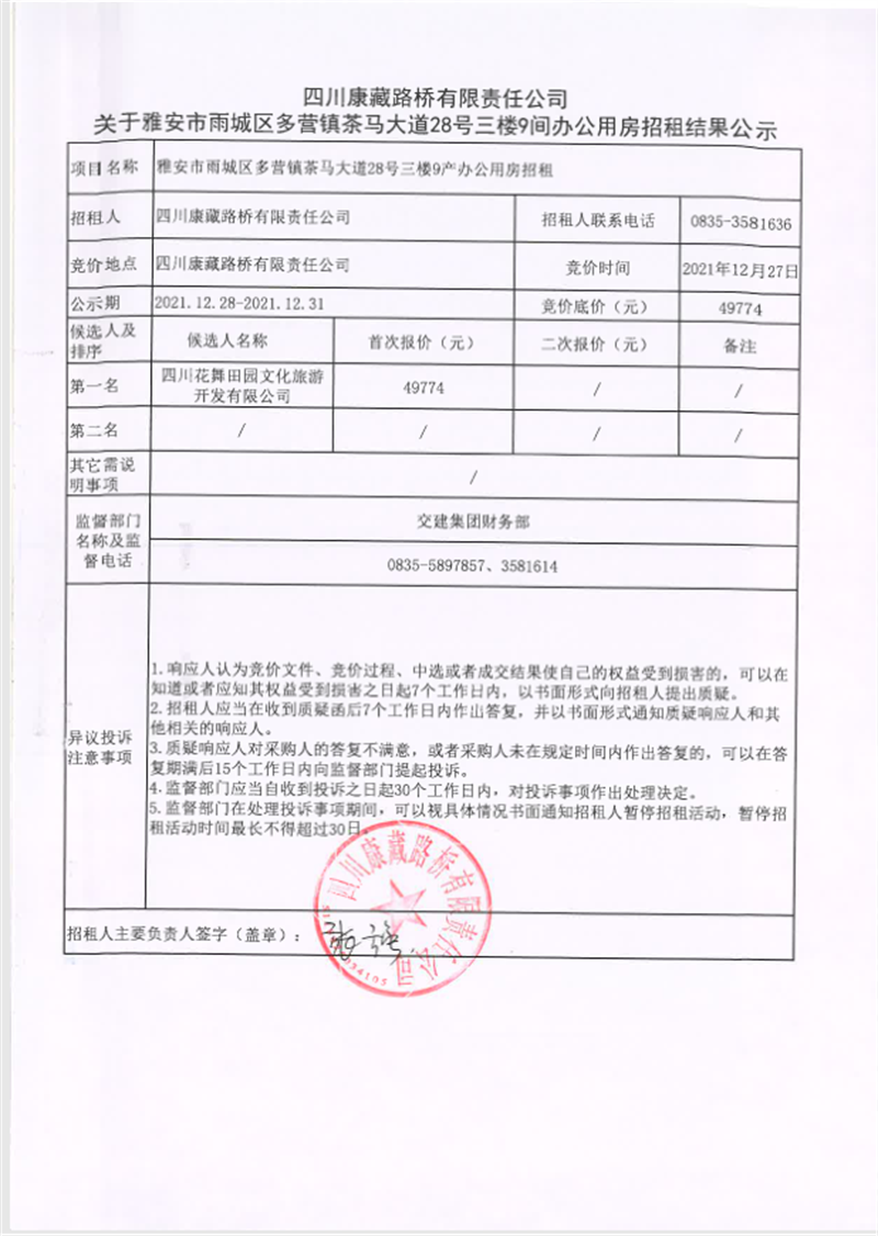 四川康藏路橋有限責(zé)任公司關(guān)于雅安市雨城區(qū)多營鎮(zhèn)茶馬大道28號(hào)三樓9間辦公用房招租結(jié)果的公示