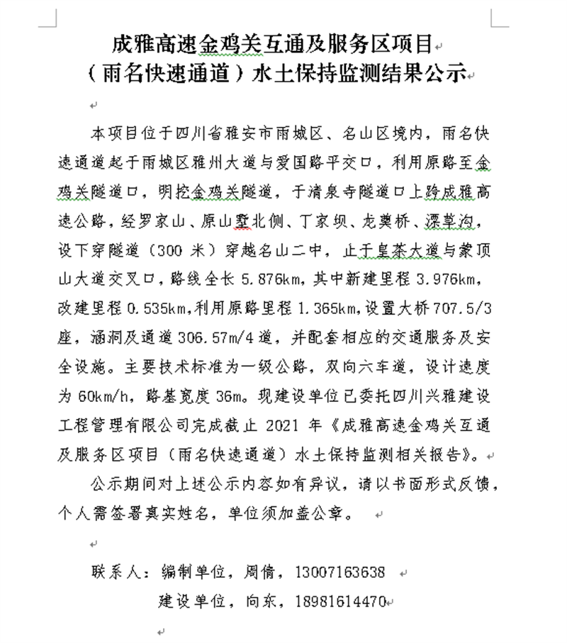 成雅高速金雞關(guān)互通及服務區(qū)項目(雨名快速通道)水土保持監(jiān)測結(jié)果公示