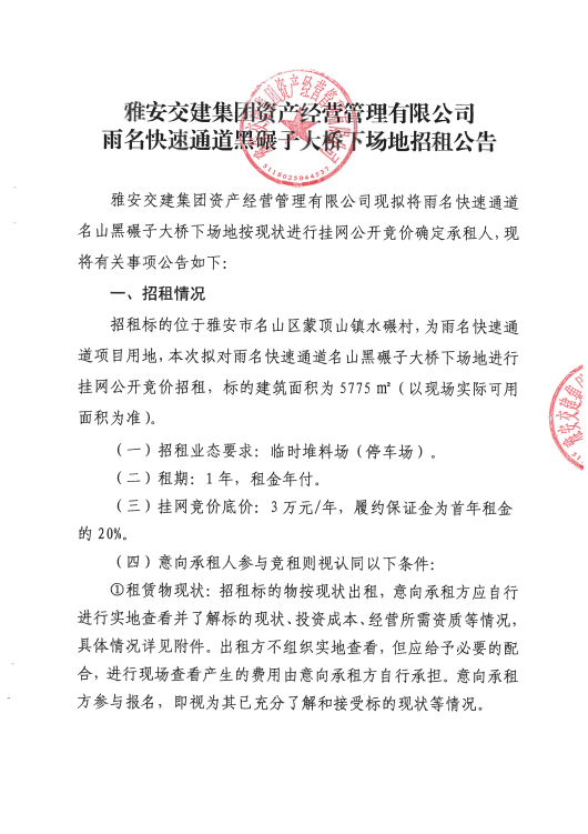 雅安交建資產(chǎn)經(jīng)營管理有限公司雨名快速通道黑碾子場地招租公告