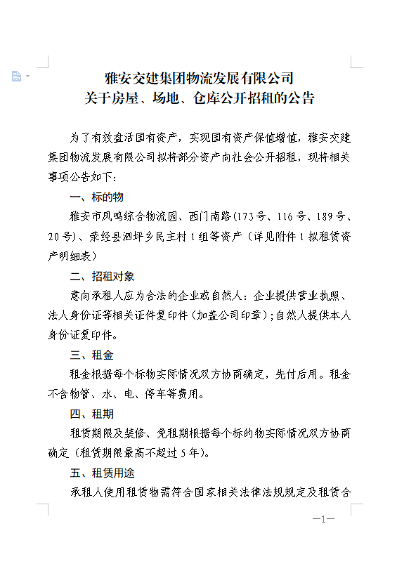 雅安交建集團物流發(fā)展有限公司關(guān)于房屋、場地、倉庫公開招租的公告附件1、2