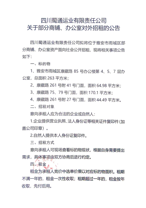 四川蜀通運業(yè)有限責任公司關(guān)于部分商鋪、辦公室對外招租的公告
