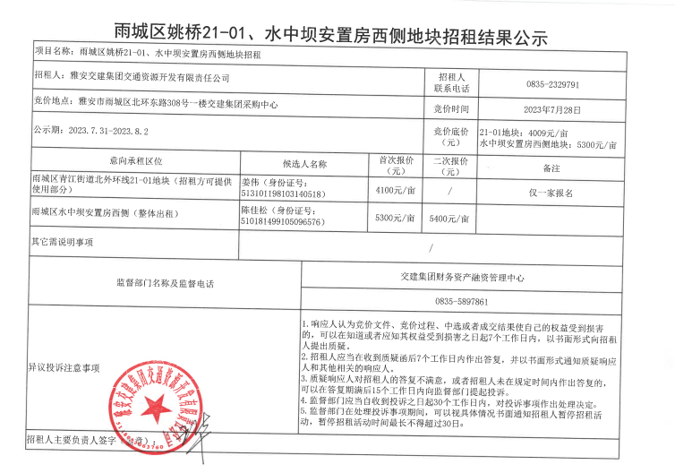 雅安交建集團交通資源開發(fā)有限責任公司關(guān)于雅安市雨城區(qū)姚橋21-01和水中壩塊塊招租結(jié)果公示