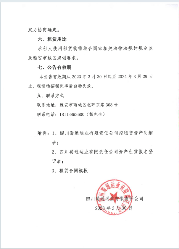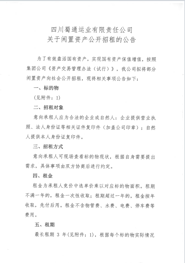 蜀通運業(yè)有限責任公司關于閑置資產公開招租的公告附件