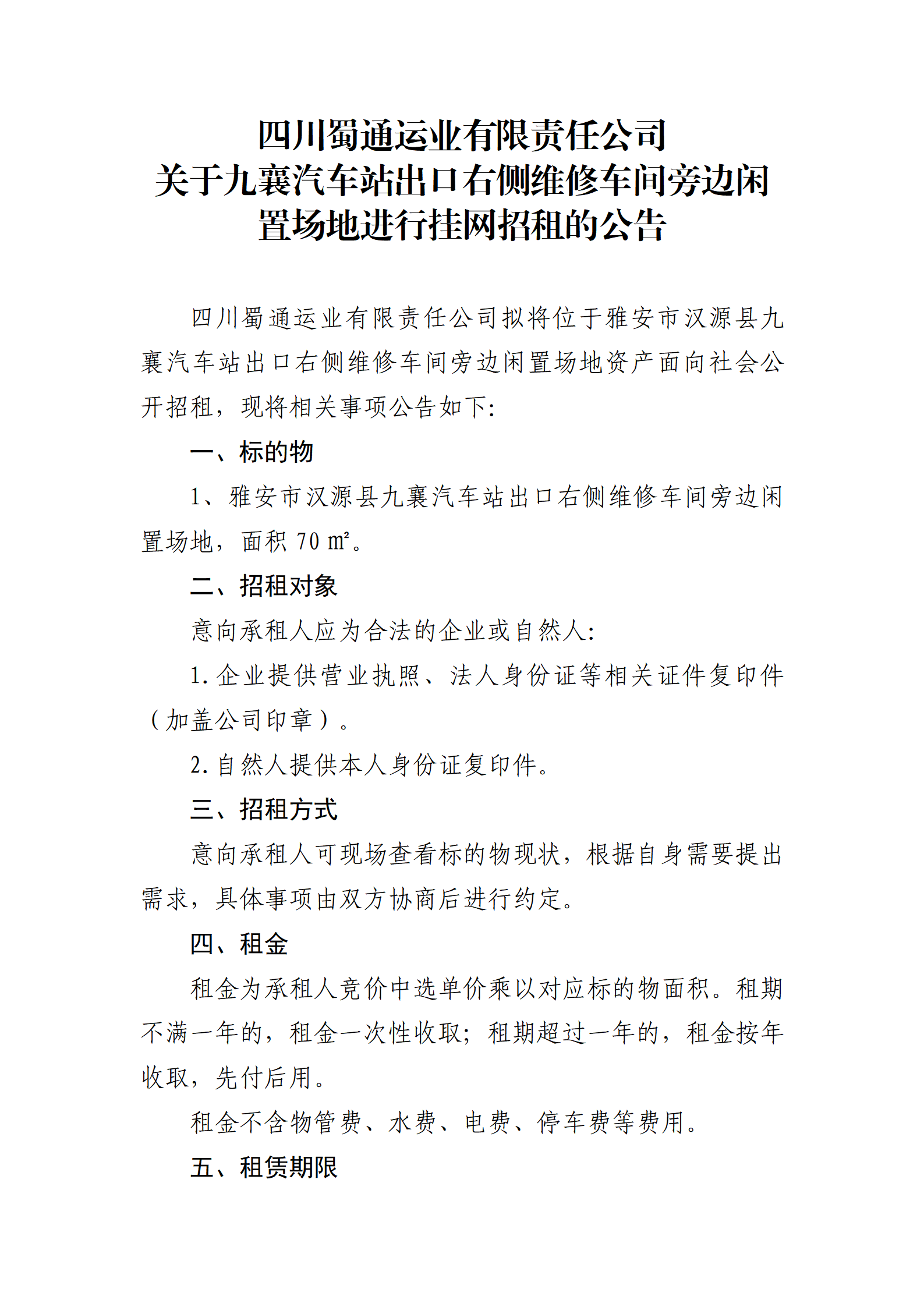 四川蜀通運業(yè)有限責(zé)任公司 關(guān)于九襄汽車站出口右側(cè)維修車間旁邊閑置場地進(jìn)行掛網(wǎng)招租的公告
