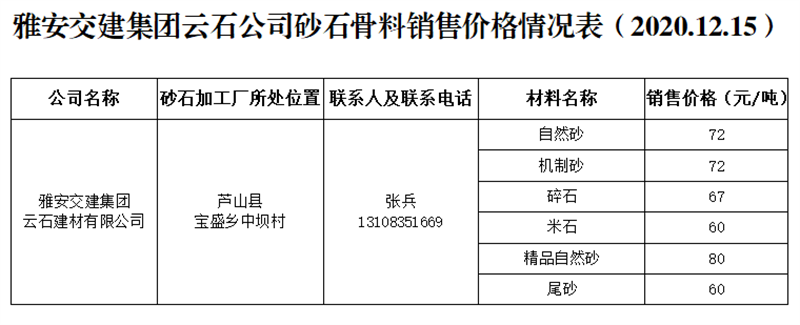 ÑŰ²½»½¨¼¯ˆFÔÆÊ¯¹«Ë¾É°Ê¯¹ÇÁÏäNÊÛƒr¸ñÇé›r±í£¨2020.12.15£©