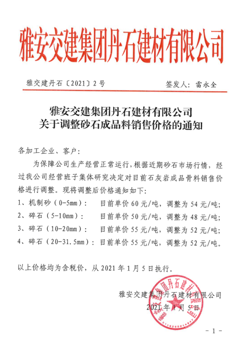 雅安交建集團(tuán)興寶公司砂石骨料銷售價格情況表(2021.1.14)