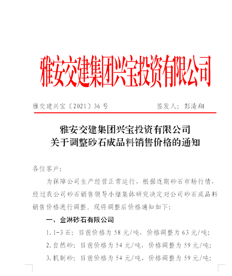 雅安交建集團(tuán)興寶公司砂石骨料銷(xiāo)售價(jià)格情況表(2021.5.22)