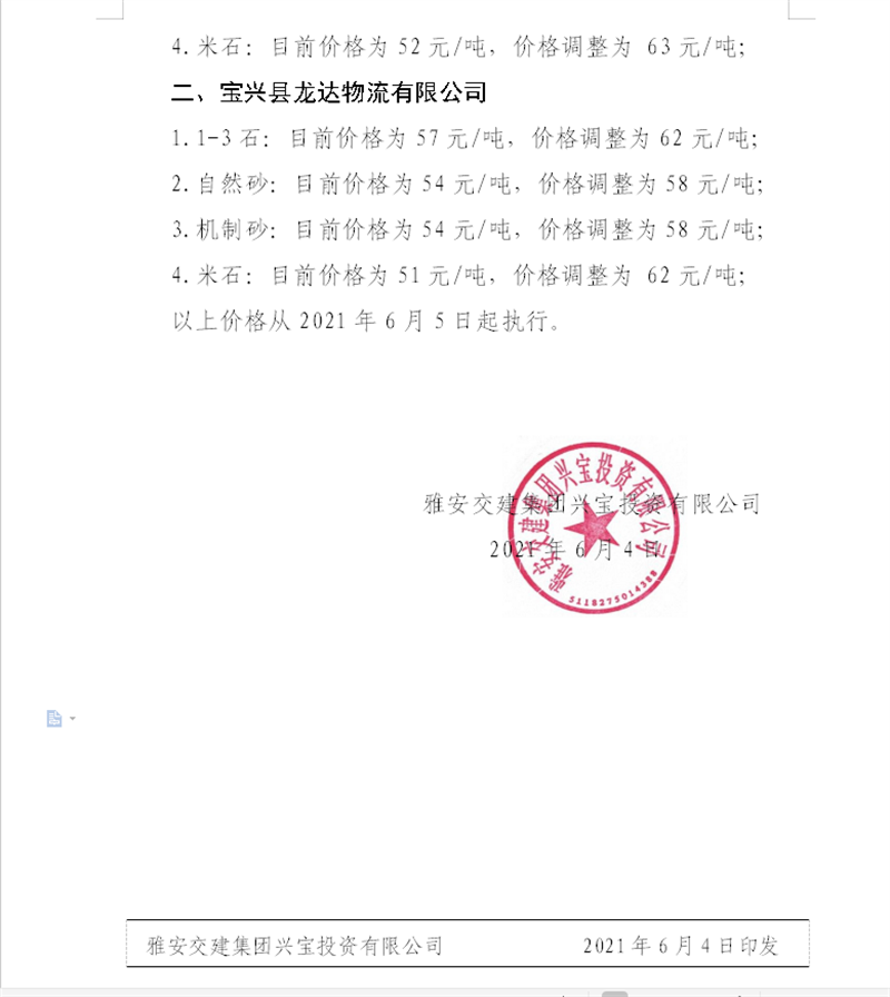 雅安交建集團(tuán)興寶公司砂石骨料銷(xiāo)售價(jià)格情況表(2021.6.5)