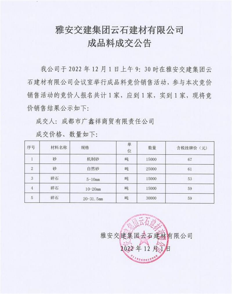 雅安交建集團(tuán)云石建材有限公司成品料競價(jià)銷售成交公告(2022-12-01)