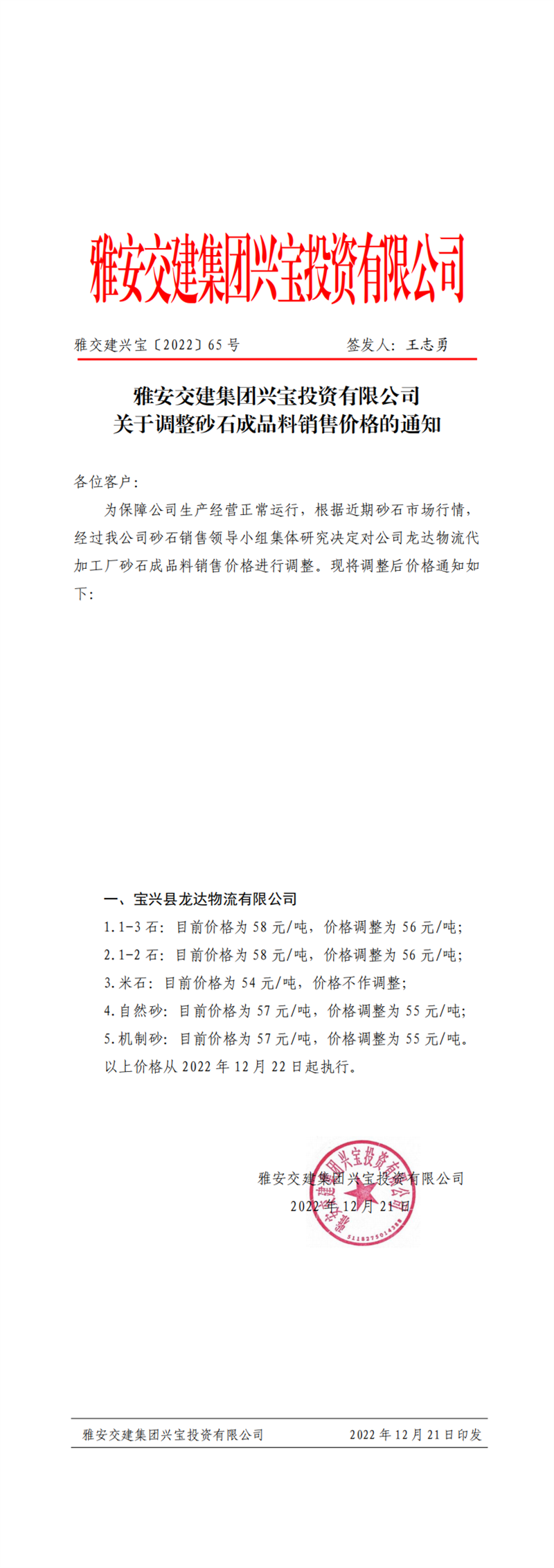 雅交建興寶〔2022〕65號 關于調(diào)整砂石成品料銷售價格的通知(2022-12-21)