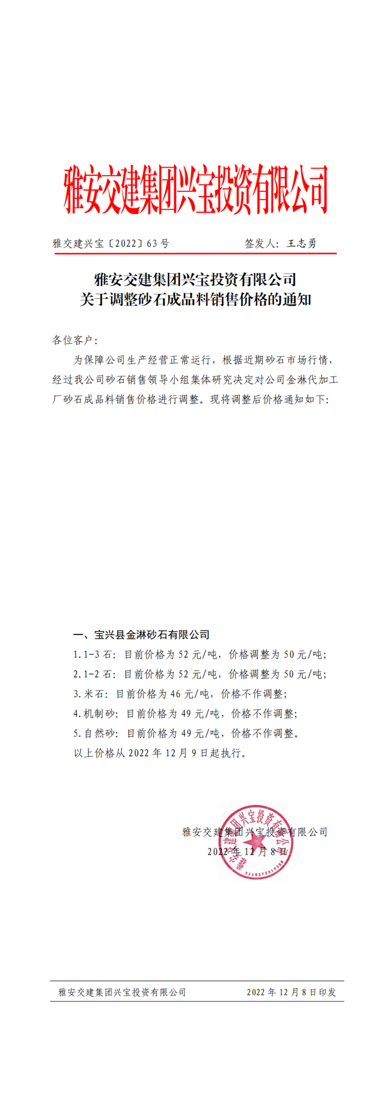 雅交建興寶〔2022〕63號(hào) 關(guān)于調(diào)整砂石成品料銷售價(jià)格的通知(2022-12-8)