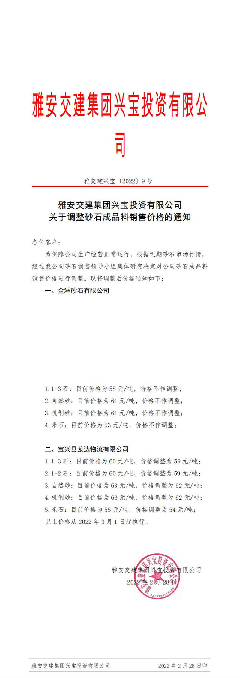 雅安交建集團(tuán)興寶投資有限公司 關(guān)于調(diào)整砂石成品料銷售價(jià)格的通知(2022-2-23)