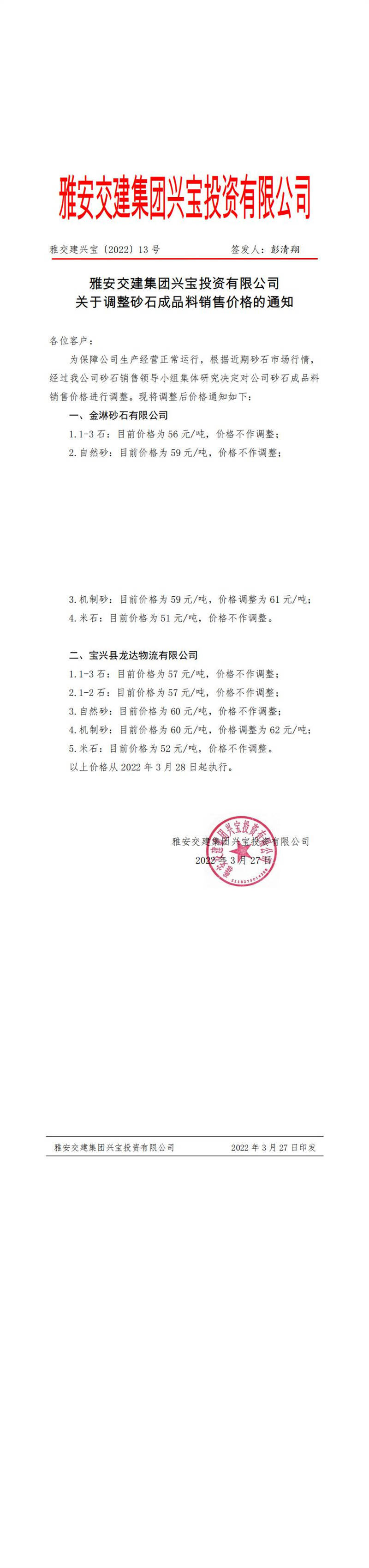 雅交建興寶〔2022〕13號(hào) 關(guān)于調(diào)整砂石成品料銷售價(jià)格的通知-3月27日