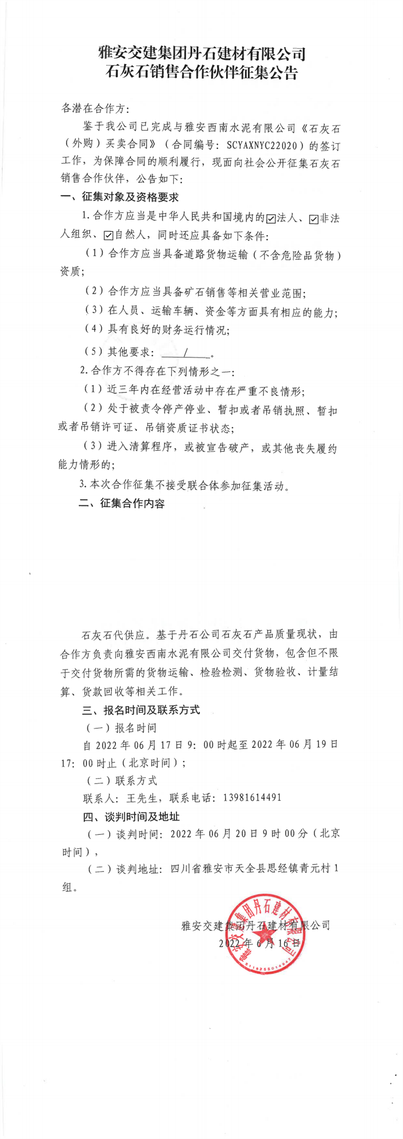 ÑŰ²½»½¨¼¯ˆFµ¤Ê¯½¨²ÄÓÐÏÞ¹«Ë¾Ê¯»ÒʯäNÊÛºÏ×÷»ï°éÕ÷¼¯¹«¸æ6-16