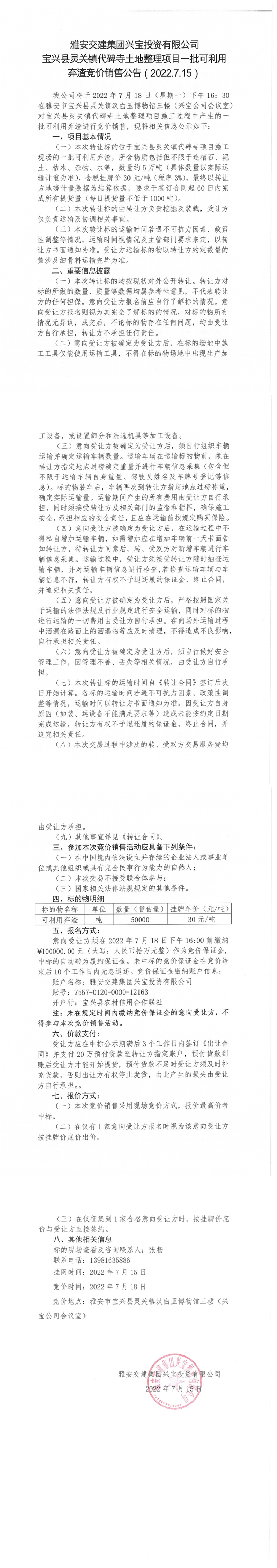 寶興縣靈關(guān)鎮(zhèn)代碑寺土地整理項(xiàng)目一批可利用棄渣競價(jià)銷售公告7.15(5萬噸)