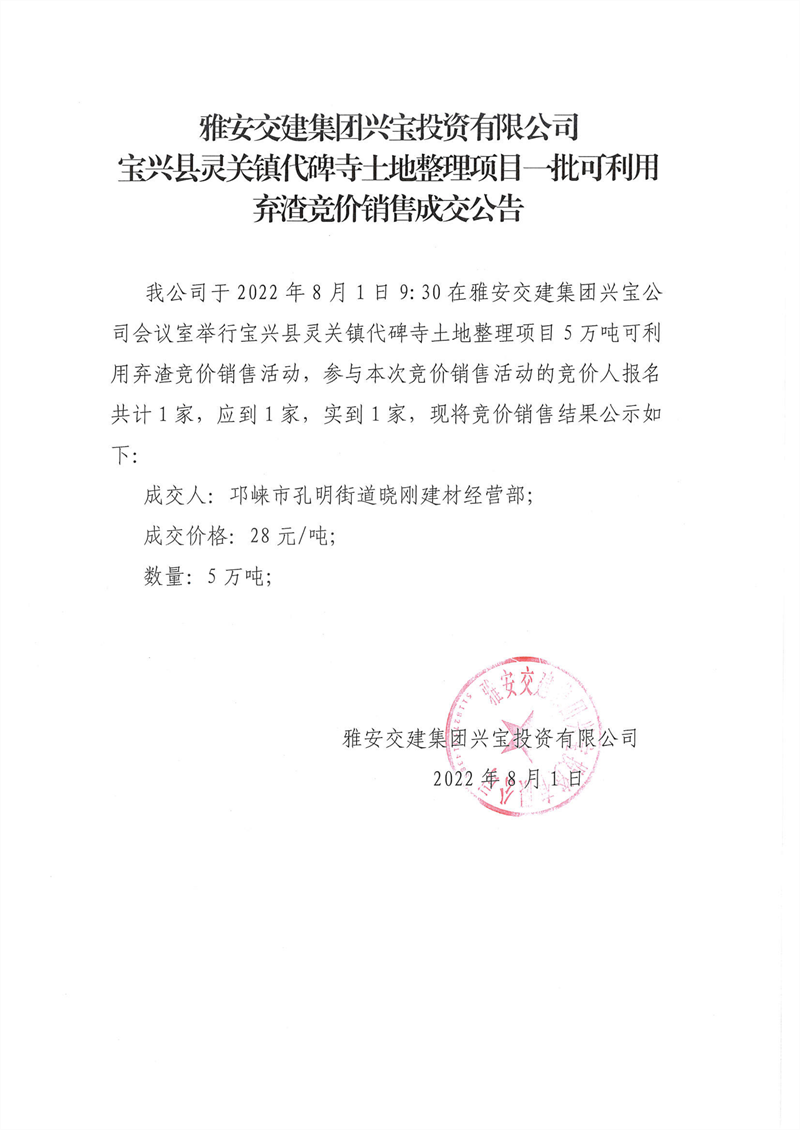 雅安交建集團(tuán)興寶投資有限公司靈關(guān)鎮(zhèn)代碑寺土地整理項(xiàng)目10萬噸可利用棄渣競價(jià)銷售成交公告(2022.8.1)