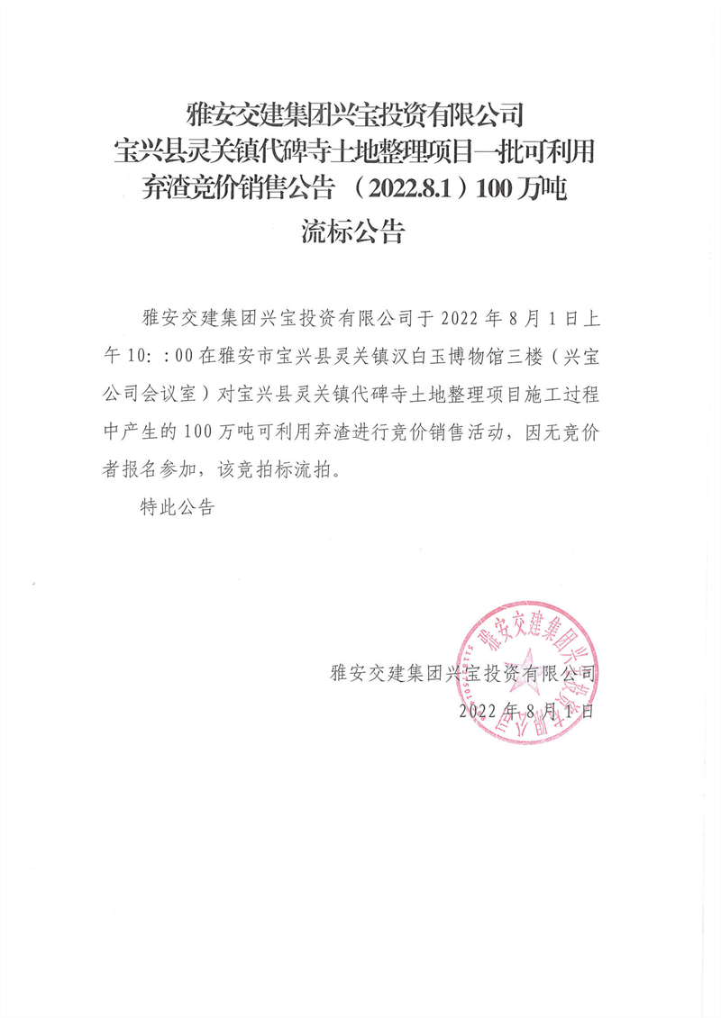 雅安交建集團(tuán)興寶投資有限公司靈關(guān)鎮(zhèn)代碑寺土地整理項(xiàng)目100萬噸可利用棄渣競價(jià)銷售流標(biāo)公告(2022.8.1)