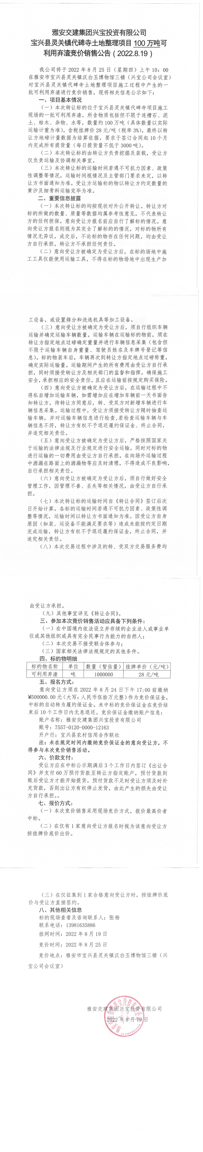雅安交建集團(tuán)興寶投資有限公司靈關(guān)鎮(zhèn)代碑寺土地整理項(xiàng)目10萬噸可利用棄渣競價銷售公告(2022.8.19)(1)
