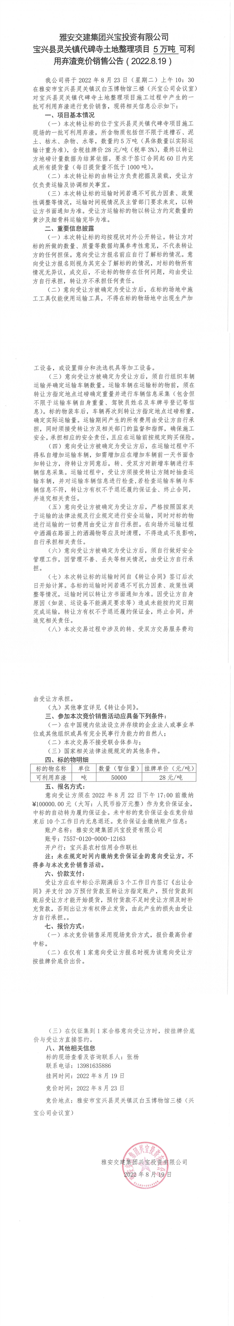 雅安交建集團(tuán)興寶投資有限公司靈關(guān)鎮(zhèn)代碑寺土地整理項(xiàng)目5萬(wàn)噸可利用棄渣競(jìng)價(jià)銷售公告(2022.8.19)(1)