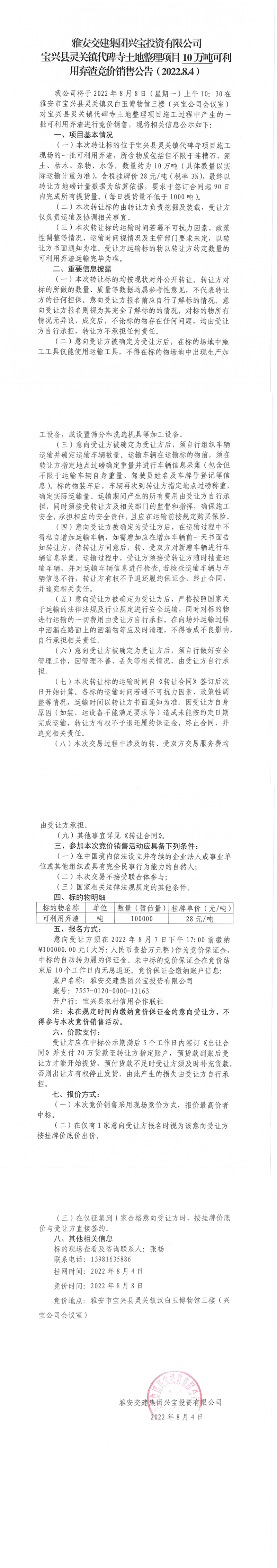 雅安交建集團(tuán)興寶投資有限公司靈關(guān)鎮(zhèn)代碑寺土地整理項(xiàng)目10萬噸可利用棄渣競(jìng)價(jià)銷售公告(2022.8.4)