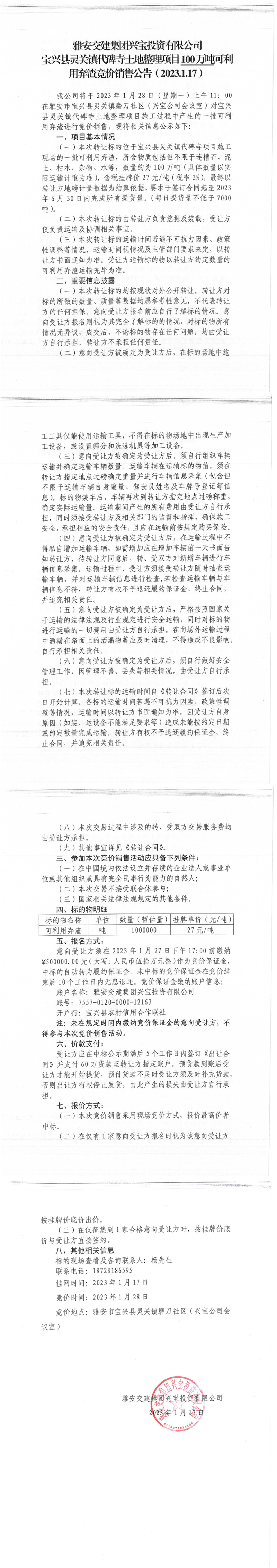 雅安交建集團(tuán)興寶投資有限公司100萬噸可利用棄渣競價(jià)銷售流標(biāo)公告(2023.1.16)