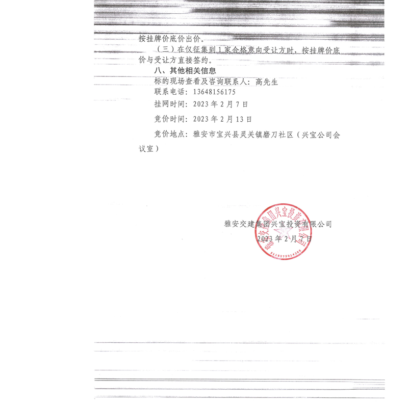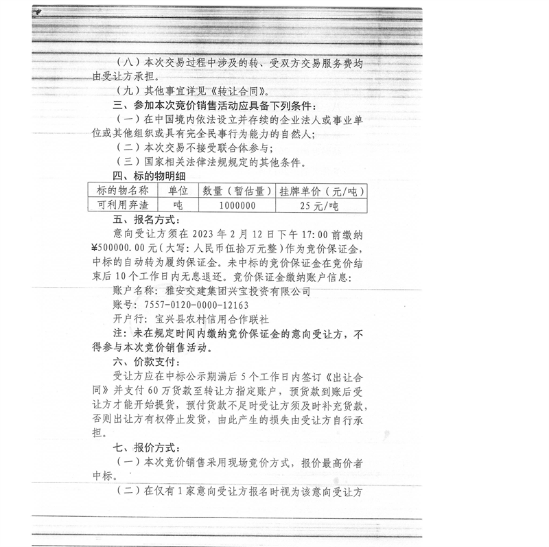 雅安交建集團興寶投資有限公司100萬噸可利用棄渣競價銷售流標(biāo)公告(2023.2.13)