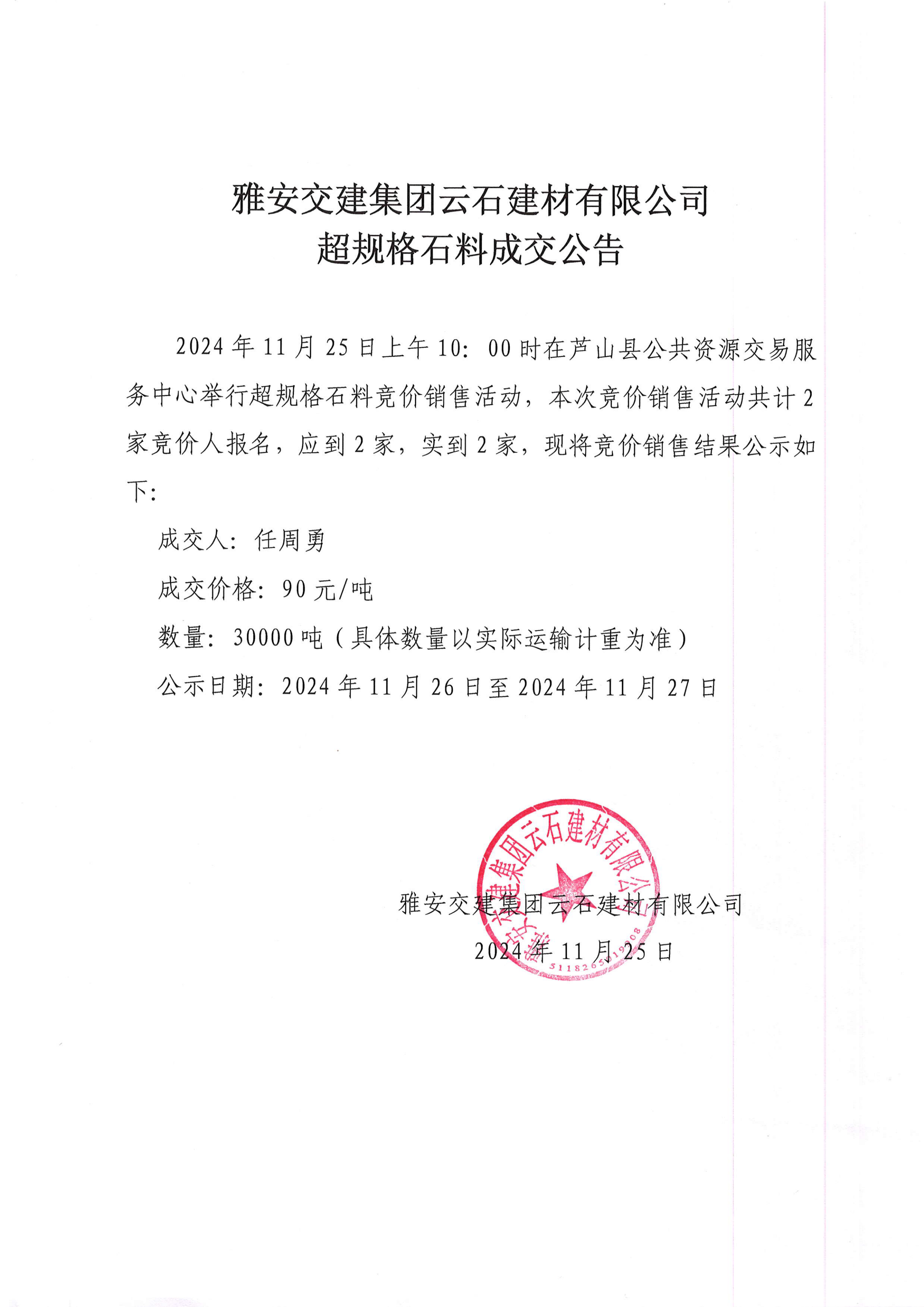 ÑŰ²½»½¨¼¯ˆF(tu¨¢n)ÔÆÊ¯½¨²ÄÓÐÏÞ¹«Ë¾³¬ÒŽ(gu¨©)¸ñʯÁϸ‚ƒräNÊ۳ɽ»¹«¸æ£¨2024-11-26£©