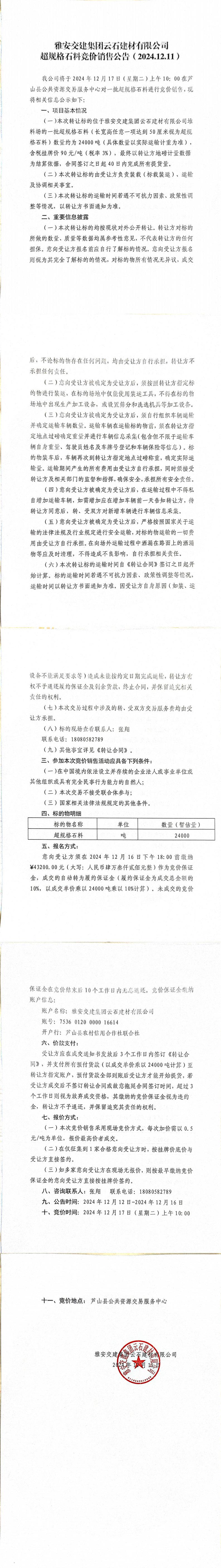 雅交建云石建材有限公司超規(guī)格石料競(jìng)價(jià)銷售公告(2024.12.11)