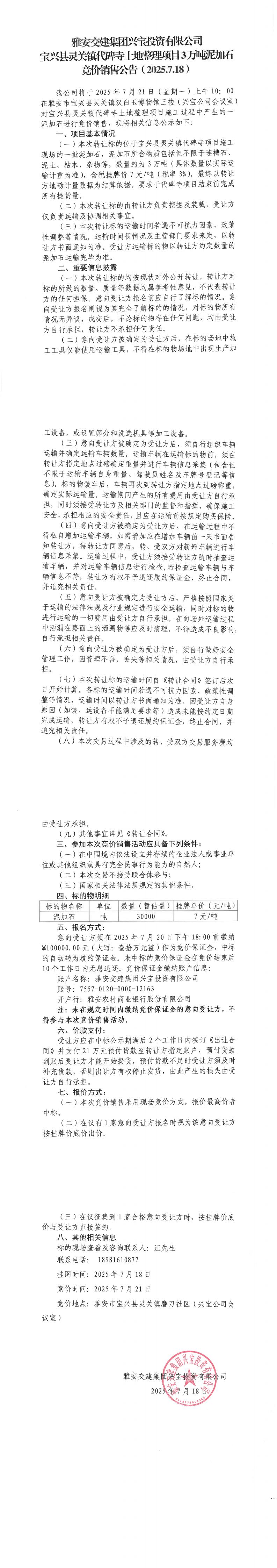 雅安交建集團(tuán)興寶投資有限公司3萬(wàn)噸泥加石競(jìng)價(jià)銷售掛網(wǎng)公告